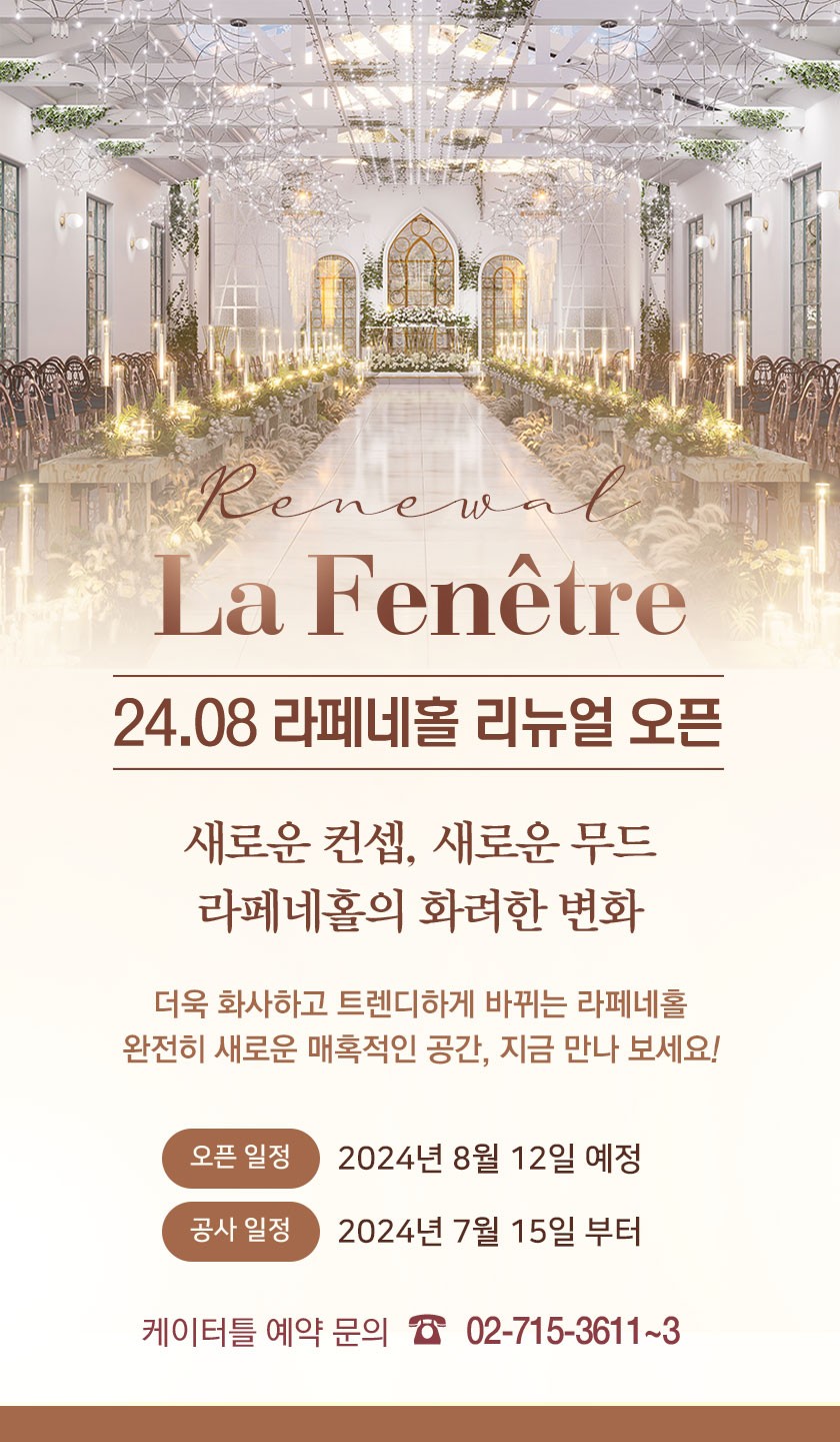 [리뉴얼] 24년 8월, 라페네홀 리뉴얼 오픈 케이터틀 2024.06.13 2488 ※ 상기 이미지는 고객님의 이해를 돕기위한 조감도이며, 공사진행간 변경될 수 있습니다. 목록 이전글 이전글이 없습니다. 다음글 다음글이 없습니다.